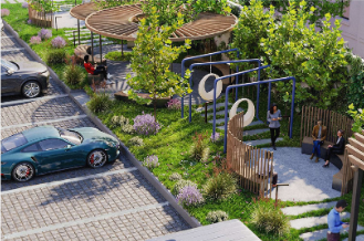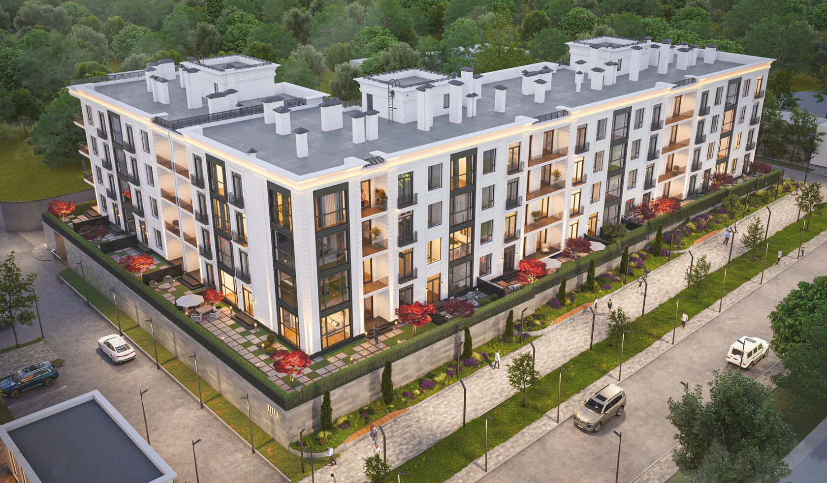 Во внутреннем камерном дворе царит атмосфера приватного курорта: среди живой зелени расположены уютные беседки с мягкими пледами, вечером разгорается открытый камин, а белый экран уличного кинотеатра дарит жителям тёплые кинопоказы под звёздным небом