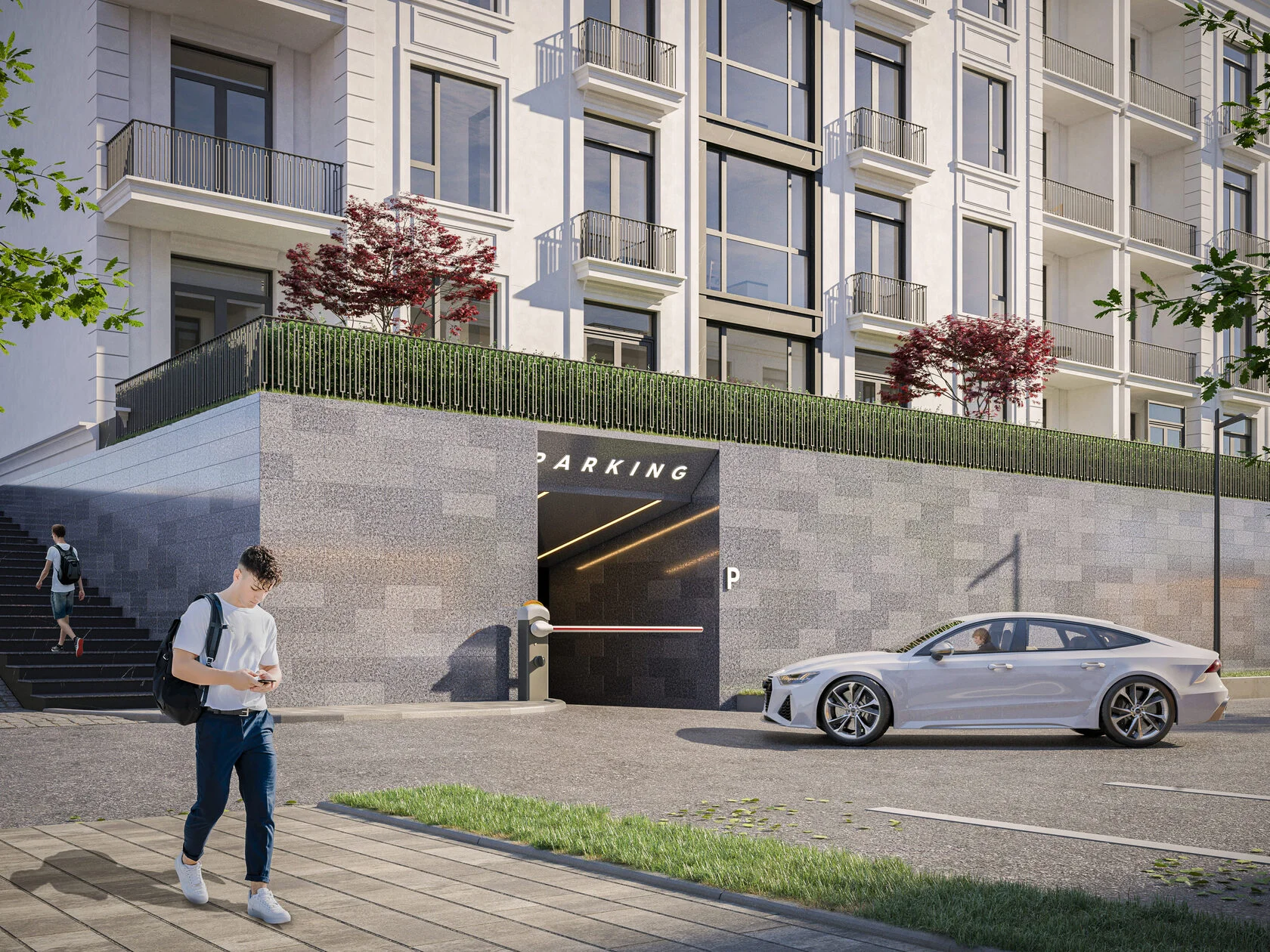 Элегантное четырёхэтажное здание из белого кирпича в стиле неоклассицизм: широкие окна, изящные балкончики, элементы декора и контрастные вставки чёрного мрамора подчёркивают утончённый характер комплекса.